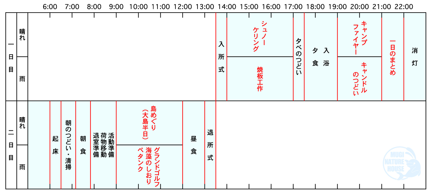 ※入・退所式、朝・夕のつどいは任意となります。(施設説明等のオリエンテーションは必須)