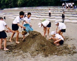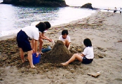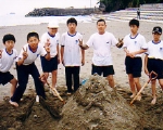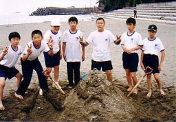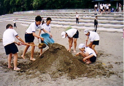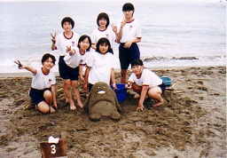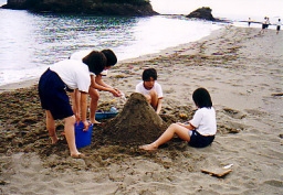 砂浜の砂を使い,自由に造形活動をします。漂流物を上手に利用すれば,さらに芸術的な作品が出来上がります。